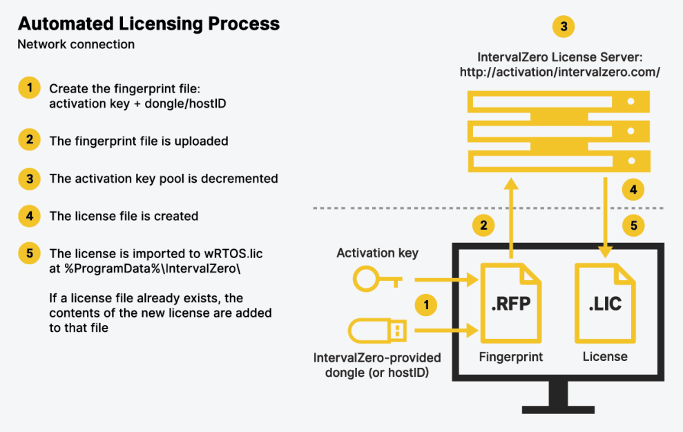 When the machine is connected to the network, the licensing process occurs automatically once a valid Activation Key is provided and activated through the eRTOS Activation command line utility.