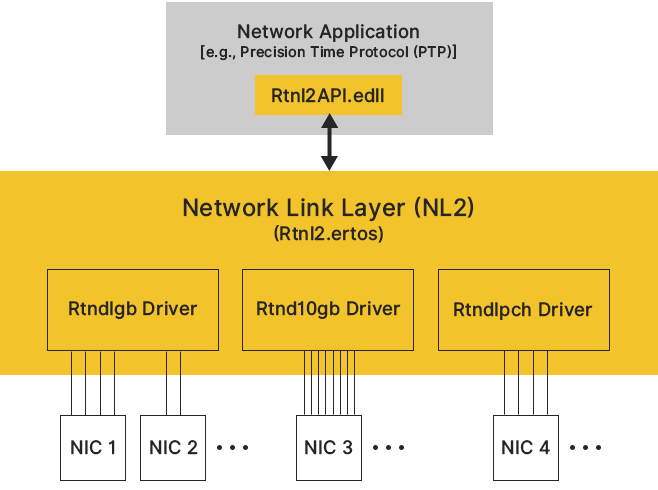 The Network Link Layer (NL2) software component provides real-time applications with abstract APIs to access network services at the Layer 2 of the OSI model, independent of the underlying hardware. The image below shows a high-level layout of the NL2 architecture.