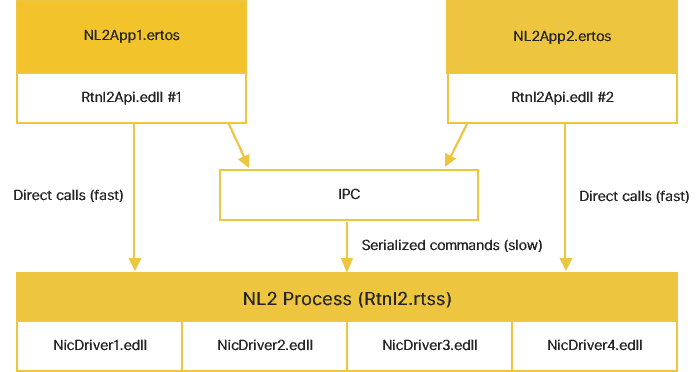 - A “fast” path from Rtnl2Api.edll into rtNL2.ertos is used for packet transmission and reception functions that require real-time performance with no context switching.