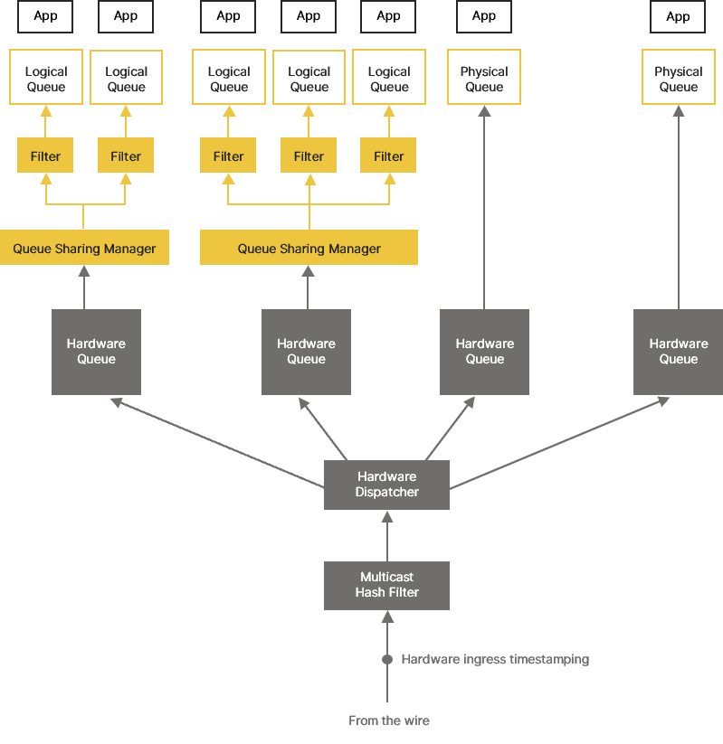 - Allow multiple applications (typically running on multiple cores) to simultaneously receive frames through the same NIC; dispatching received frames is handled at the hardware level.