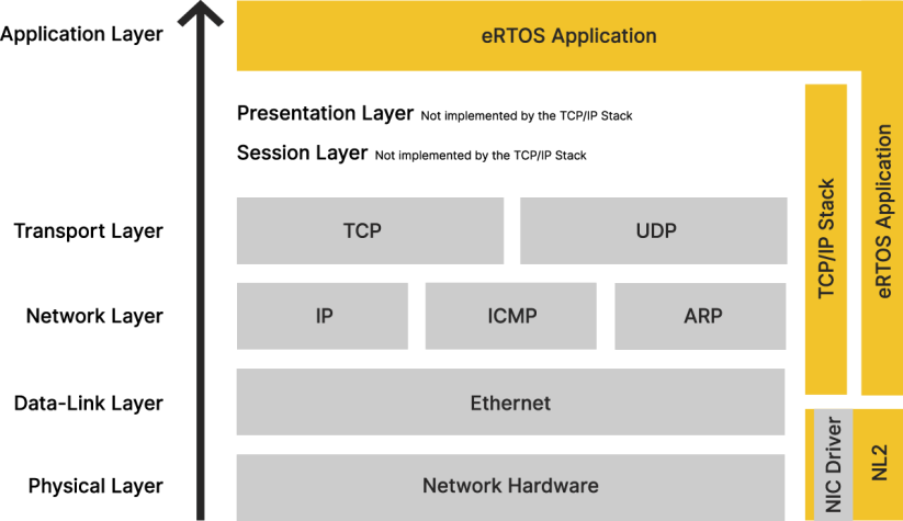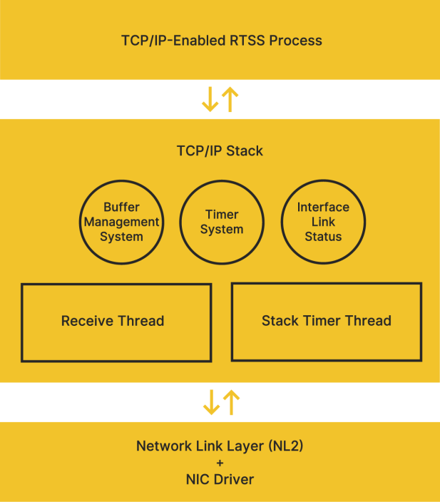 The TCP/IP Protocol Stack communicates with the Network Link Layer (NL2) that accesses the physical transport layer (network card) via a Real-time network device (RTND) driver running under the Real-Time Kernel. The components that make up the TCP/IP Stack are discussed below.