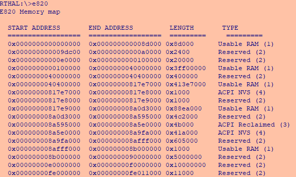 Displays e820 memory map. Example:
