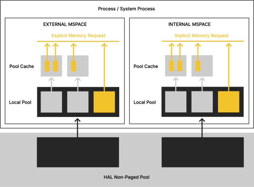 The diagram below depicts an example of memory allocation for a Process / system process from the HAL Non-paged Pool to external and internal MSpaces.