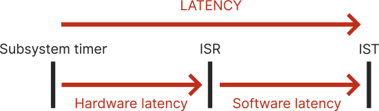 System Timer Response Latency is measured as the total time from when a kernel timer interrupt sends a signal to when that signal is recognized by software running in an Interrupt Service Thread (IST). As shown in the diagram below, Latency is made up of Hardware latency, the time it takes for a signal to be recognized by an Interrupt Service Routine (ISR), and Software latency, the time it takes from ISR to the routine running in IST.