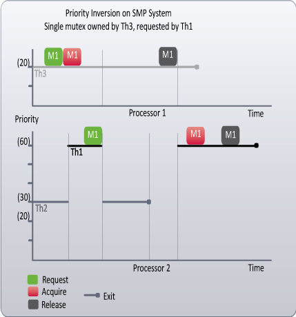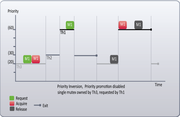 - When thread Th1 requests mutex M1 with a call to either RtWaitForSingleObject or RtWaitForMultipleObjects, the owner of mutex M1 (which is thread Th3) is promoted to the priority of the requesting thread (priority 60).