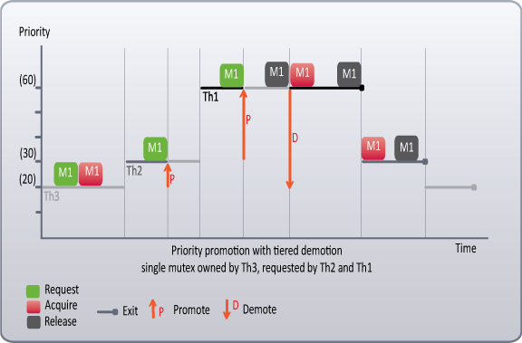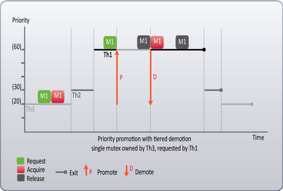 - Priority Promotion with Tiered Demotion - Elevates a low priority thread to the level of the highest priority thread that is waiting for the shared mutex. When the promoted thread has released the mutex requested by a higher priority thread, it is demoted to its native priority level, allowing the higher priority blocked thread to acquire the mutex and to run.