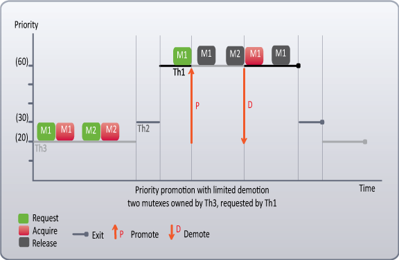 - Priority Promotion with Limited Demotion - Elevates a low priority thread to the level of the highest priority thread that is waiting for the shared mutex. When the promoted thread has released all mutexes that it owns, it is demoted to its native priority level, allowing the higher priority blocked thread to acquire the mutex and to run.