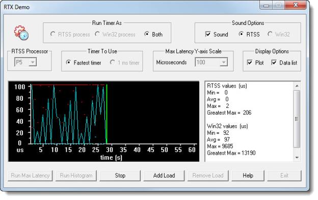 The data area records the minimum, average, and maximum latencies for the interval. It also shows the greatest maximum value over the course of the data retrieval (from clicking on the Run Max Latency button until clicking on the Stop button). RTSS latency values are shown in cyan, Win32 values in red. When Win32 values are too high, they are plotted at the upper boundary of the window.