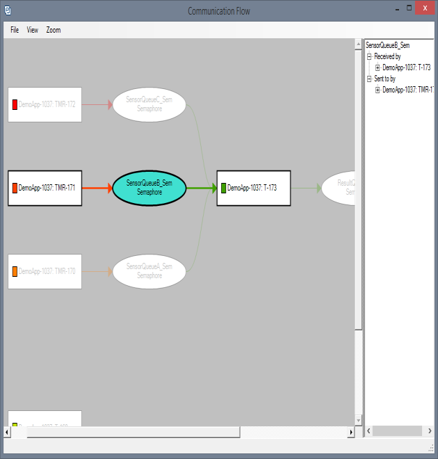 The Communication Flow graph provides a quick overview of the communication and synchronization between actors in a trace, through semaphores, and mutexes. This graph can be generated over a whole trace, or for a specific interval only.