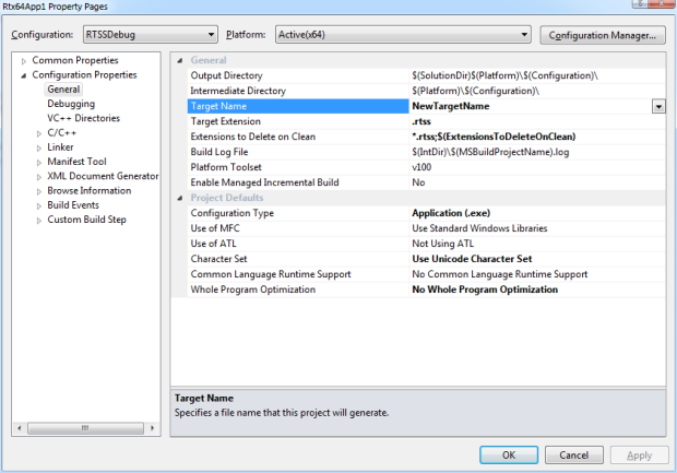 If you need to change the Target Name configuration property of an RTSS or RTDLL project in Visual Studio, you need to make an additional change to the project’s settings. For instance, the default value of the Target Name property is “$(ProjectName)”: