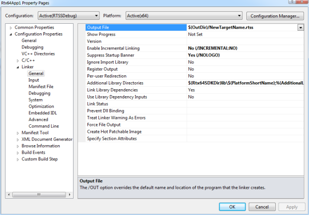 After making the above change to the project settings, the RTX64 StampTool utility will fail to find the generated binary. You must also change the Output File property in the General section of the Linker properties to specify NewTargetName in the name of the binary: