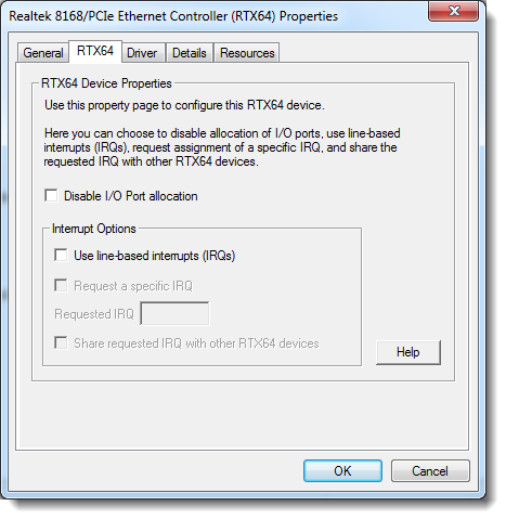 You can choose to disable allocation of I/O Ports, use line-based interrupts (IRQs), request assignment of a specific IRQ, and share the requested IRQ with other RTX64 devices through the RTX64 Properties page for a selected RTX64 PCI/PCIe device.