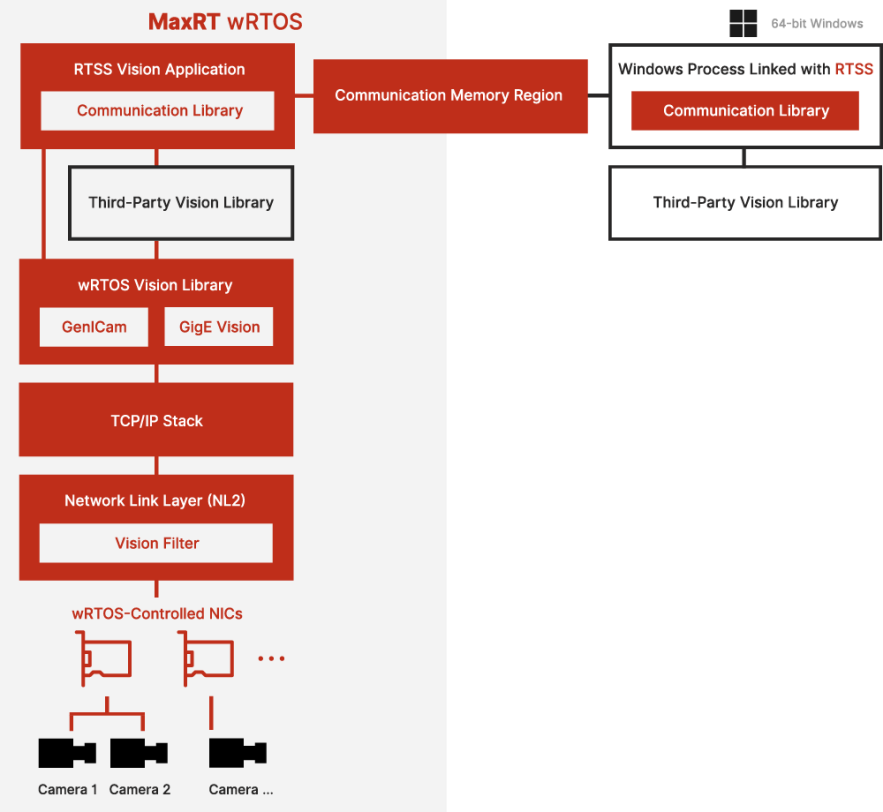 Vision provides functionality for controlling GigE Vision Cameras within the RTSS environment. Using Vision, you can discover cameras on the network and query their configuration settings (such as image width, height, pixel formats, etc.) and image data. To do this, Vision uses the GenICam™ GenAPI to read in the Camera Description File, and the GigE protocols to control the camera and receive image data from it. You can layer a third-party vision library on top of Vision to provide all the functionality within that library. Finally, Vision provides a communication library for passing images between RTSS and Windows, which can be used to perform tasks which are more easily done in the Windows environment, such as displaying captured images in a GUI.