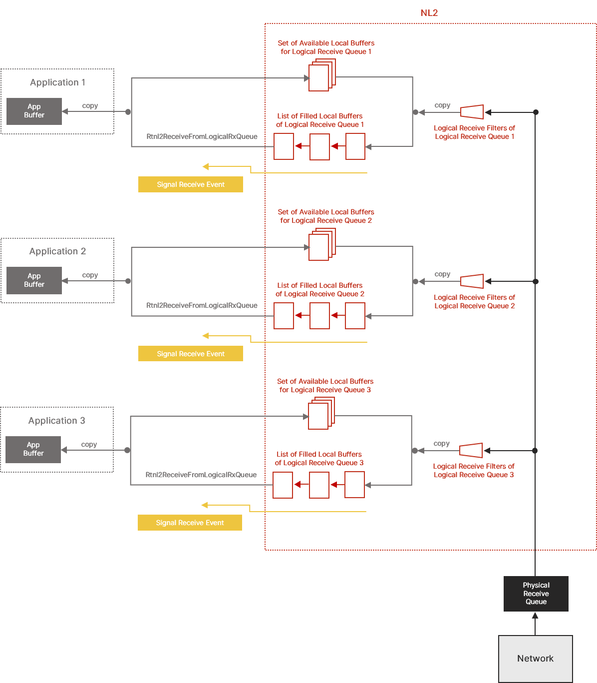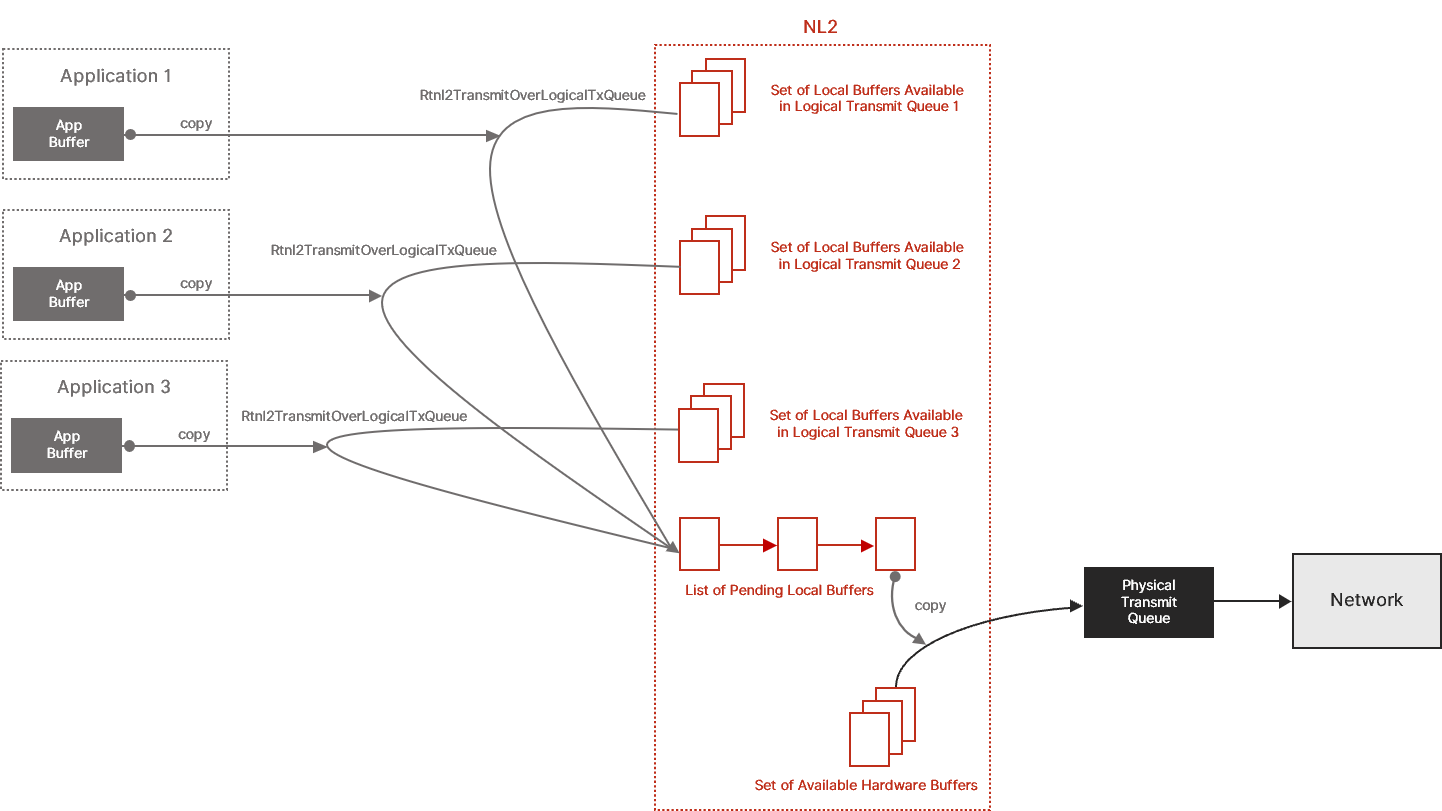 Note: It might happen that some buffers are still in the Physical Transmit Queue when Rtnl2ReleasePhysicalTxQueue is called, either consumed but not extracted yet, or even not consumed yet. This is not a problem as the NL2 will take care of reclaiming those buffers on behalf of the application once they are consumed by the hardware. This flush operation is performed in background and is transparent to the user application.