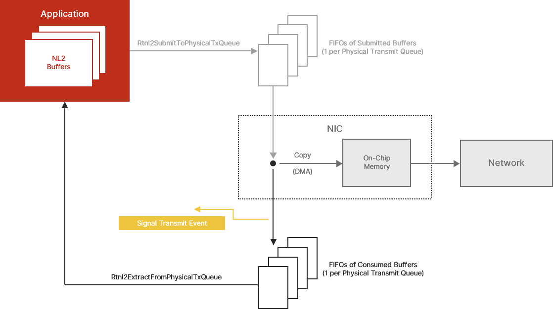 Non-cyclic applications prefer to be notified when consumed buffers are available rather than calling Rtnl2ExtractFromPhysicalTxQueue on a timer basis. Those applications can request the creation of an Event object signaled by the NL2 whenever the NIC triggers the corresponding hardware interrupt.