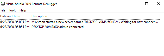 You should see the Host/Target connection in the Visual Studio Remote Debugging Monitor dialog.