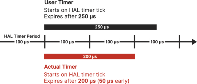 In this example, the user timer, which starts on a HAL timer tick, is configured to expire after 250 μs. Because the timer’s expiration occurs between HAL timer ticks, the timer is rounded down, causing the actual timer to expire after 200 μs, 50 μs earlier than expected.