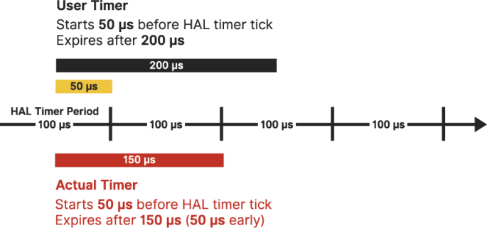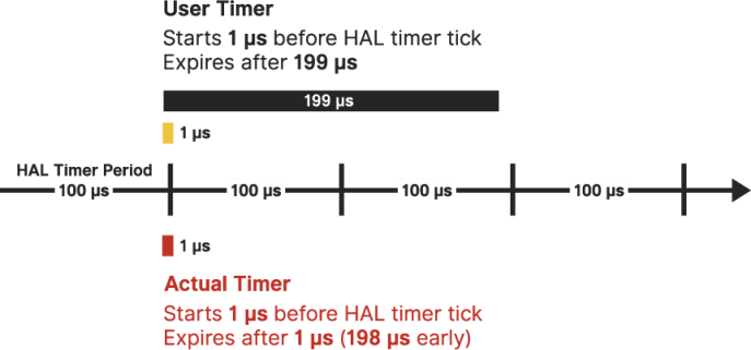 In this example, the user timer start time occurs 50 μs before a HAL timer tick (indicated by the gold band in the diagram). As a result, the user timer, configured for 200 μs, expires between HAL timer ticks, causing the timer to be rounded down. The actual timer expires after 150 μs, 50 μs earlier than expected.