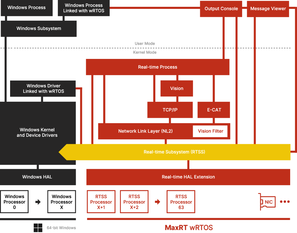 The Real-time Subsystem (RTSS) provides a priority based preemptive scheduler that is Symmetric-Multiprocessor aware. This allows for scheduling of RTSS threads across all dedicated RTSS processors, while still allowing access to Windows processes running on other processors for communication with Windows processes (RTAPI) and drivers (RTKAPI) through standard inter-process communication (IPC) and shared memory.
