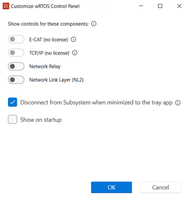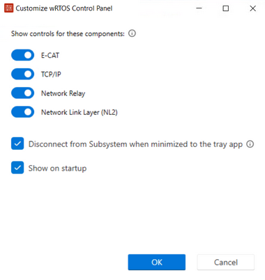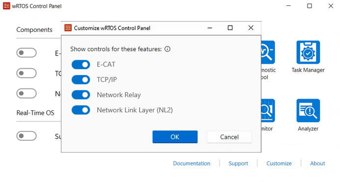 When opening wRTOS Control Panel for the first time, the Customize wRTOS Control Panel dialog appears, allowing you to select the desired components to display. Toggle the switches on to display those features, then select OK. The selected components will be displayed on wRTOS Control Panel.