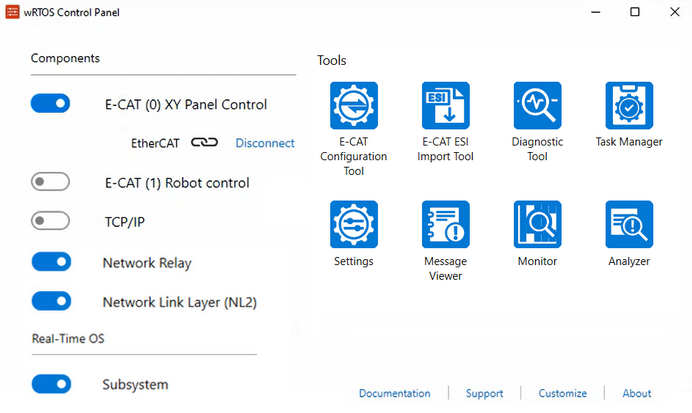 After selecting the desired components, you can control the wRTOS Subsystem and wRTOS components using their toggle switches. You can also view the component status once they have started.
