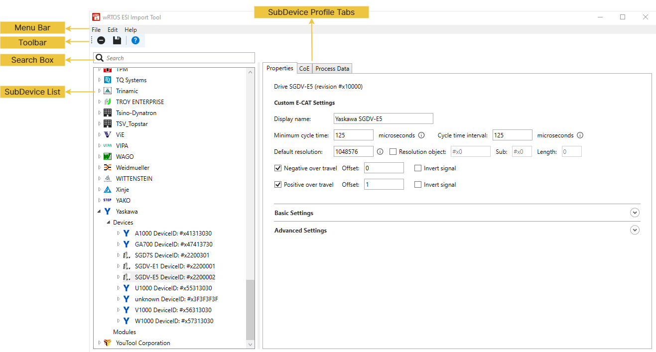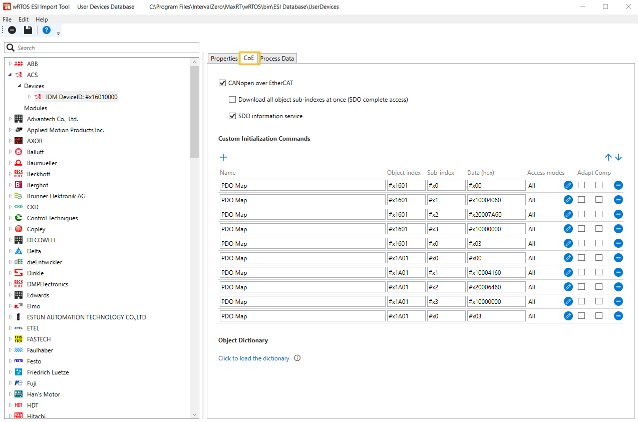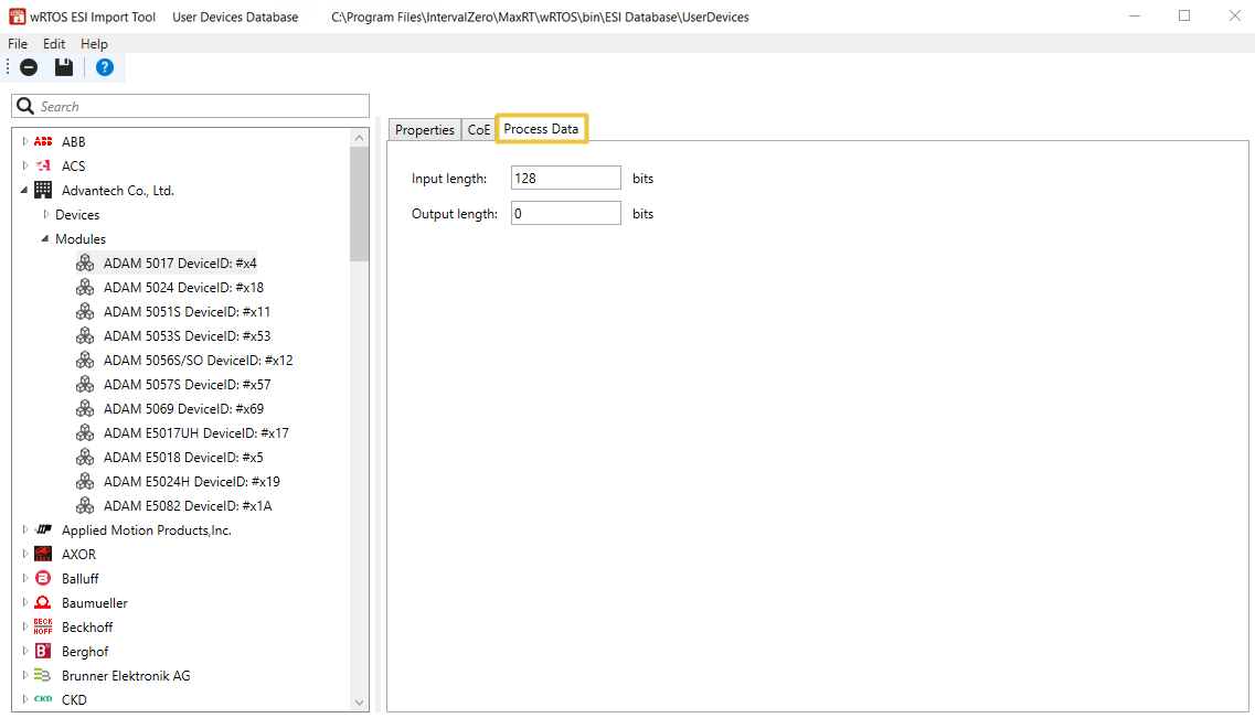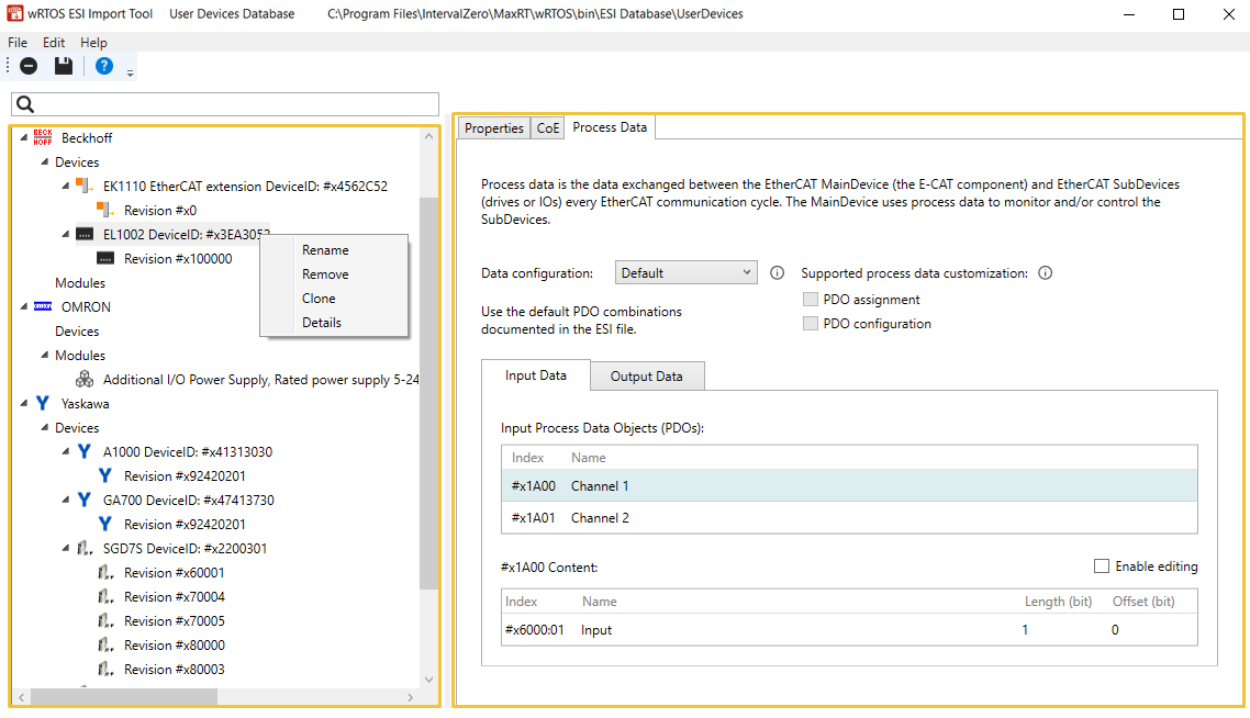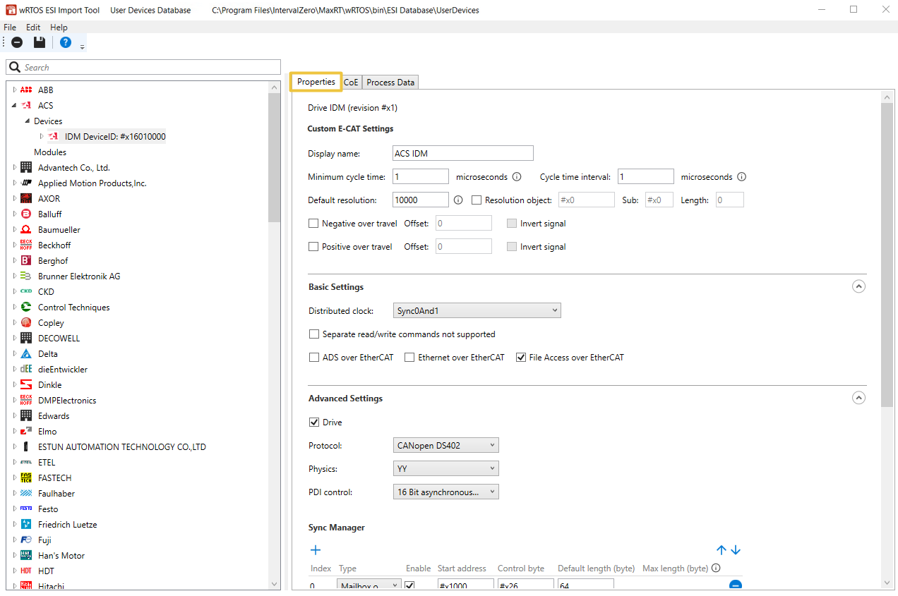 Note: Modification in the Default Devices Database is not allowed. If you want to modify the device's ESI data in the default database, import the data to User Devices Database and modify it from there. Note: You can use the default database to view device details of all supported EtherCAT devices or use it as a base to edit or add the desired devices. Remember to save the modified database to a different location by choosing File > Save As. You can open this edited database later using Open ESI Database.