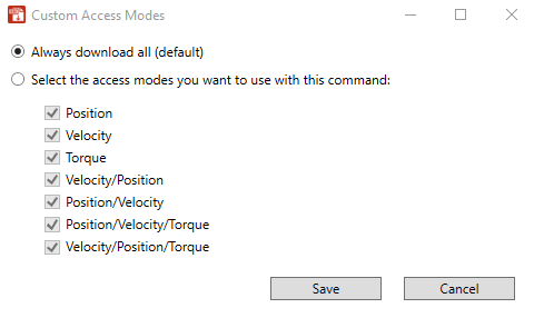 - SetAxisAccessMode: Select one of the Access Mode, and the E-CAT component will automatically select the corresponding variables (PDO entries). The E-CAT component will decide whether to add the target position/velocity/torque and the actual position/velocity/torque variables to process data exchange according to the Access Mode you choose. Note that the associated McControlMode can only be used if the device supports the variables required for the selected Access Mode.