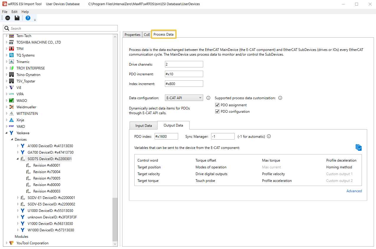 The E-CAT ESI Import Tool can automatically detect a device's supported PDOs and the corresponding variables (PDO entries), and display variables in the Input Data and Output Data fields.