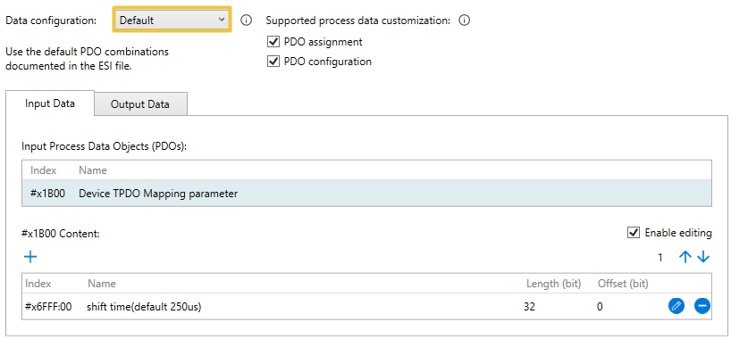 - Setup steps: Select Default from the Data configuration drop-down menu, the supported PDOs and the corresponding variables (PDO entries) will be displayed in the Input Data and Output Data fields. The device will use these default PDO combinations for process data exchange.