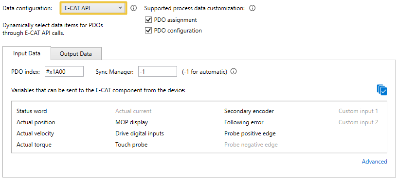 - E-CAT API: You can use the E-CAT API calls to automatically select the variables (PDO entries) for process data exchange.