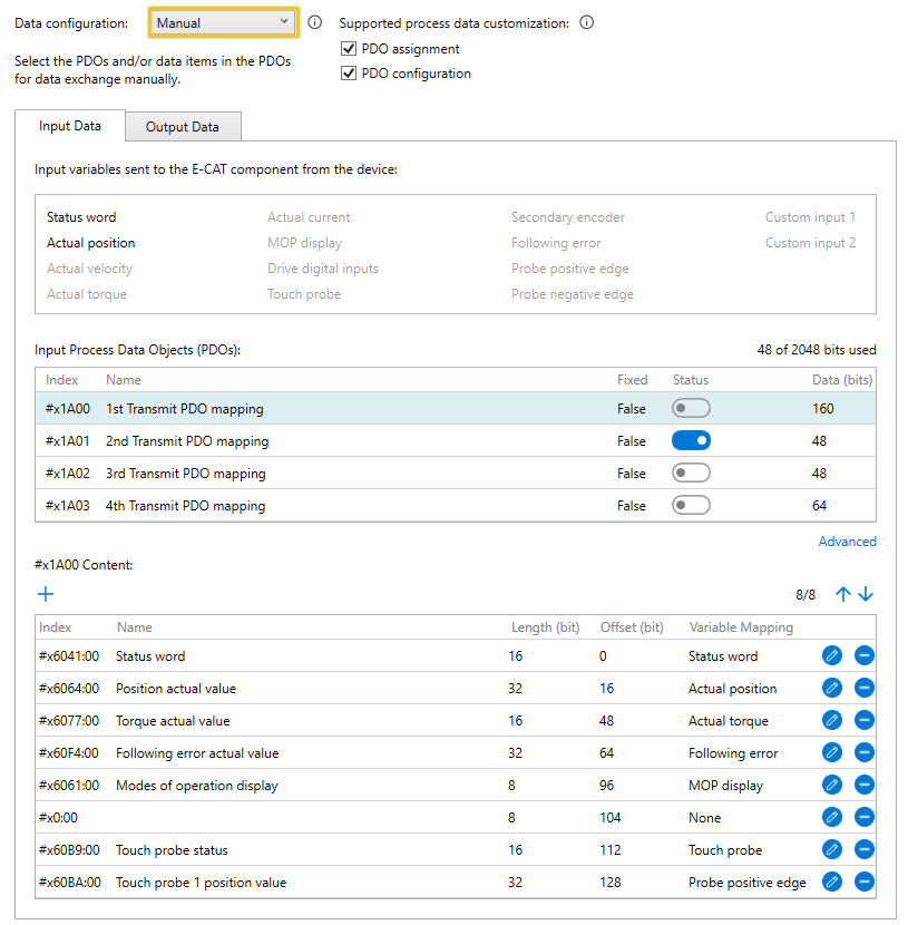- Manual: You can select the PDOs and the corresponding variables (PDO entries) for process data exchange. The variables that can be selected depend on the attributes of the PDOs, as well as the device's supported PDO assignment and PDO configuration.