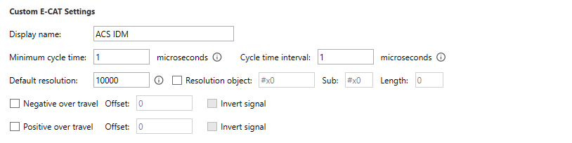 - Resolution object: Check this box if you want the E-CAT component to read a specified resolution from the drive's Service Data Object (SDO) rather than the value setup in this field. Please ensure the drive has an SDO object with the resolution. Input the index of the resolution object in the box.