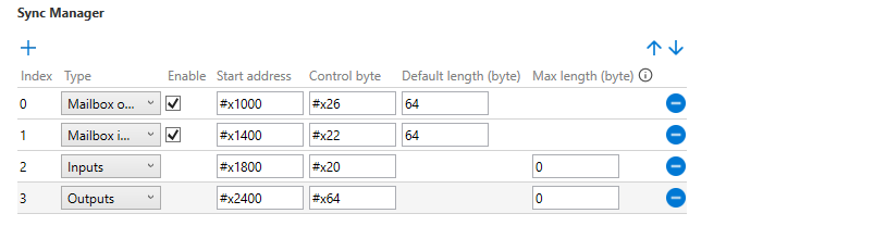 - Mailbox output: Transmit mailbox data from the MainDevice to the SubDevice. Check the Enable box to activate Sync Manager's memory control. Uncheck the Enable box to disable Sync Manager's memory control.