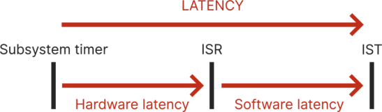 wRTOS Latency View displays a visual latency comparison between Windows and wRTOS cores. System Timer Response Latency is measured as the total time from when a Subsystem timer interrupt sends a signal to when that signal is recognized by software running in an Interrupt Service Thread (IST). As shown in the diagram below, Latency is made up of Hardware latency, the time it takes for a signal to be recognized by an Interrupt Service Routine (ISR), and Software latency, the time it takes from ISR to the routine running in IST.