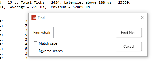 To search console output, click the Find button or use the CTRL + F shortcut to open the Find dialog: