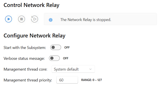 On the Network Relay page in wRTOS Settings, you can control (start and stop) and configure the Network Relay component.