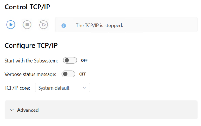 On the TCP/IP page in wRTOS Settings, you can control (start and stop) the TCP/IP component and configure its settings.